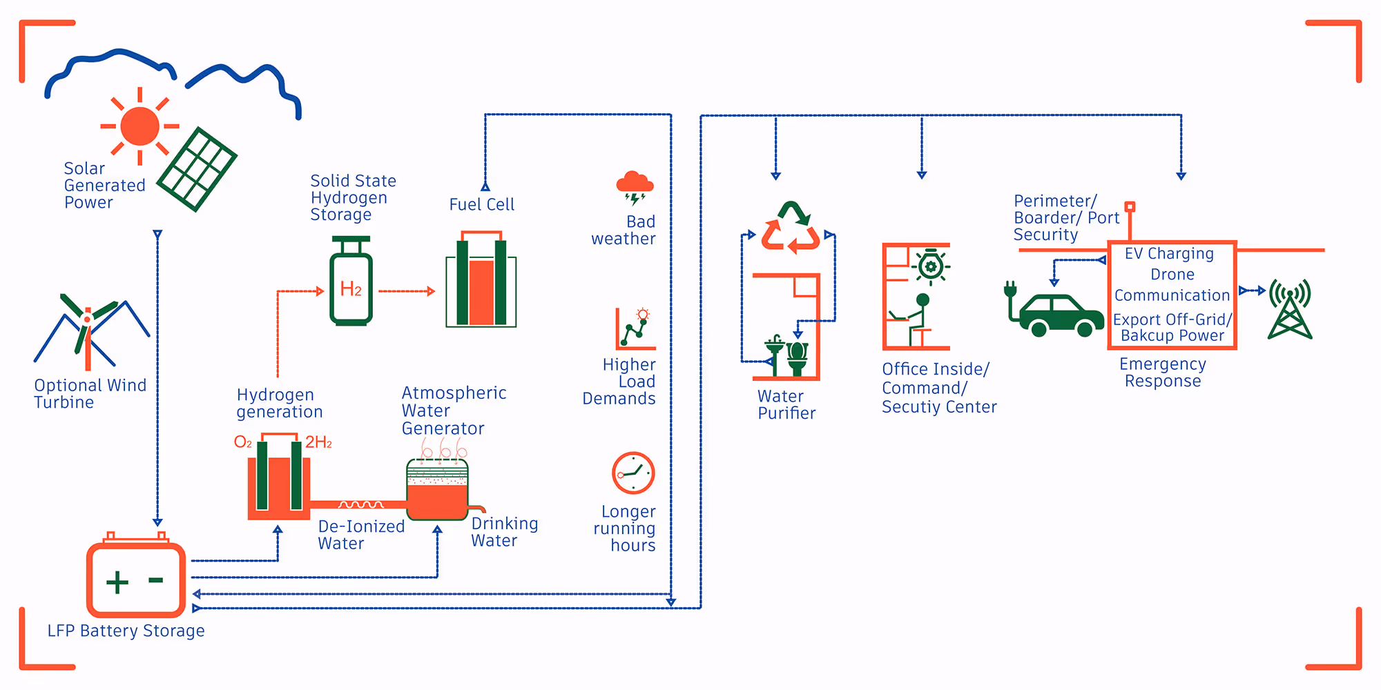 - Low-pressure, solid-state hydrogen storage: Optional backup power that extends energy resilience for weeks or months, functioning as a long-duration energy reserve or to refuel hydrogen-powered UAS/USV/UGVs.